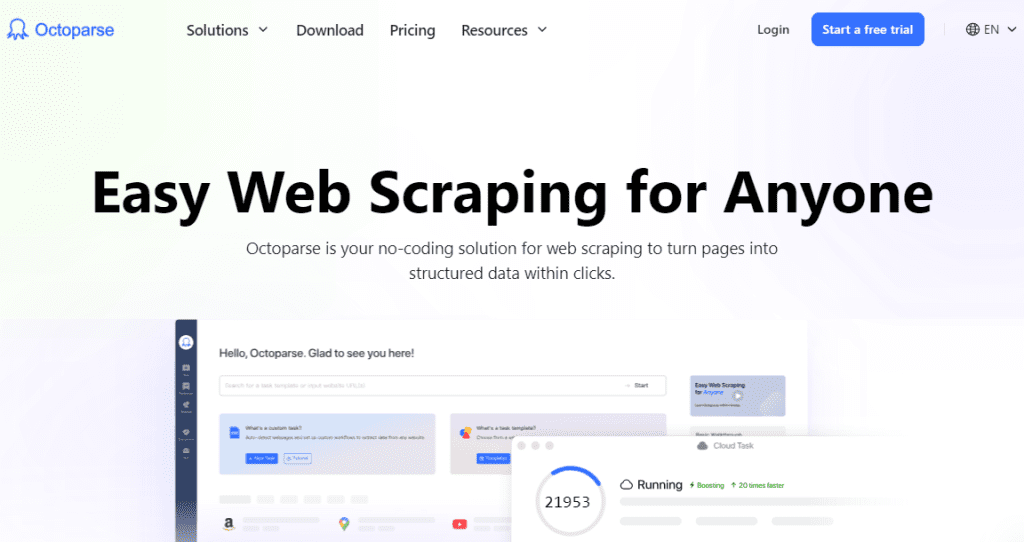 Kalau kamu nyari tool scraping yang visualnya menarik dan gampang dipakai, Octoparse jawabannya. Ini adalah tool no-code yang memungkinkan kamu buat scrape data dari website tanpa harus ribet dengan coding. Cukup drag-and-drop elemen yang kamu mau ekstrak, terus Octoparse bakal ngelakuin sisanya.