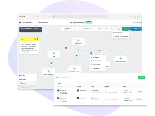 Integrate.io adalah salah satu platform data pipeline yang memungkinkan kamu buat ekstraksi data dari berbagai sumber dengan cara yang efisien. Platform ini mendukung integrasi dengan banyak aplikasi populer seperti Salesforce, Shopify, dan Google Analytics. Integrate.io ini cocok banget buat kamu yang punya kebutuhan kompleks dalam manajemen data.